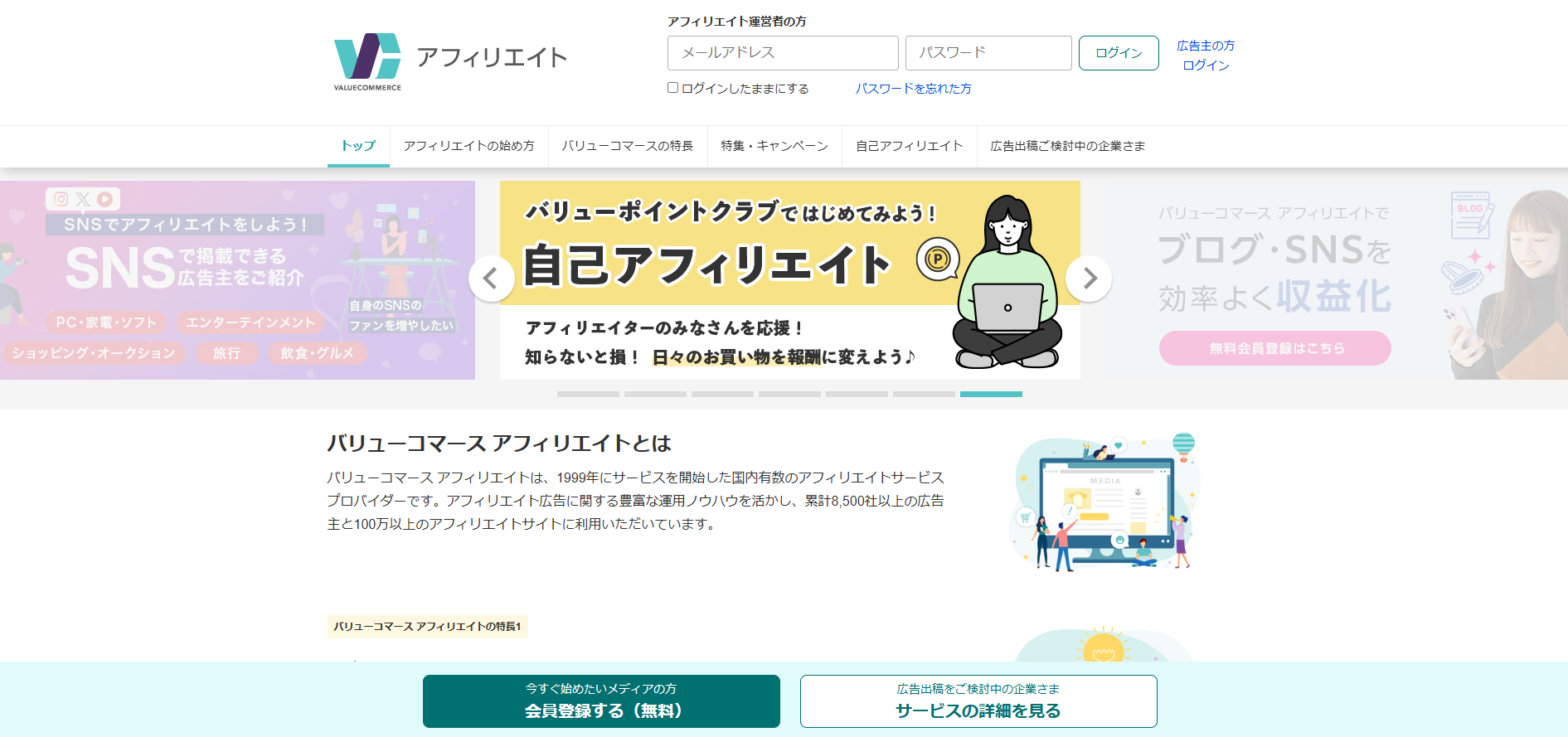 信頼と実績を最優先して選びたいなら、バリューコマースがおすすめです。同社は1999年に日本で初めてアフィリエイトサービスを開始し、25年以上にわたって国内のアフィリエイト市場を支えてきました。