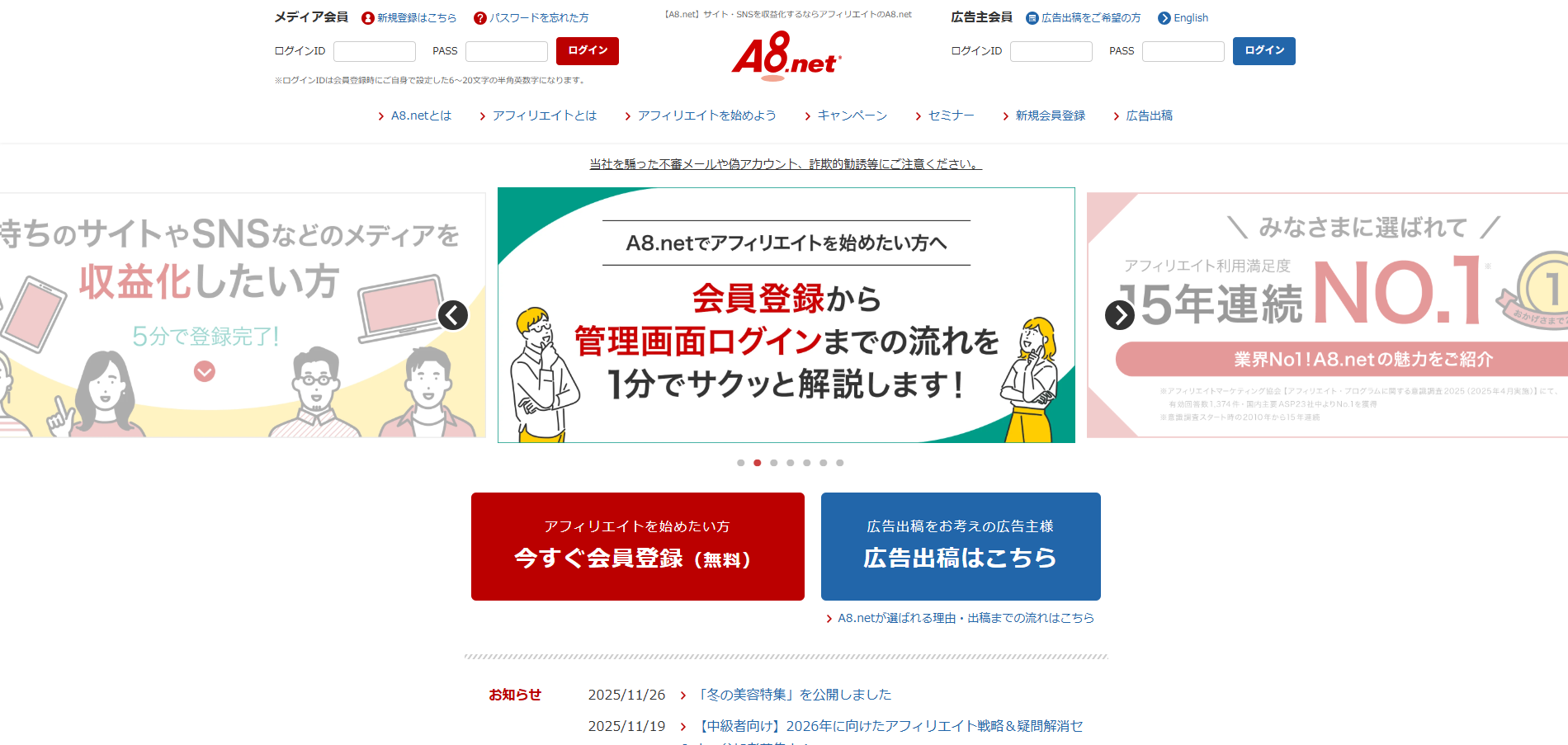 累計広告主数は8,500社以上で、登録サイト数は100万サイト以上という国内最大級のネットワーク規模を誇ります。金融広告主も多数参加しており、大手証券会社や銀行の案件も取り扱っています。比較サイトやランキングサイトなどの有力メディアとのネットワークが、強固な点も見逃せません。