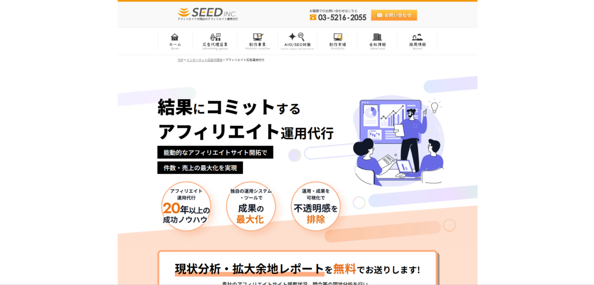 株式会社シードは、人材領域を含め20年以上にわたりアフィリエイト広告を運用してきた実績があり、攻め(成果最大化)と守り(リスク管理)を両立した戦略設計を強みとしています。媒体選定からクリエイティブ改善、承認率を意識した導線設計まで一貫して支援が可能です。