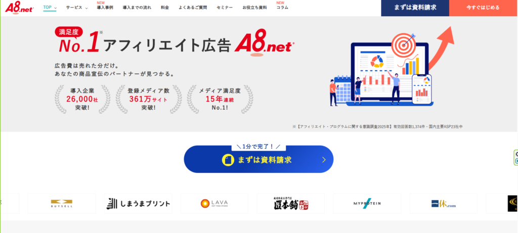 A8.netは、登録メディア数361万サイトを誇る国内最大級クラスのメディアネットワークです。NISAやiDeCoを検索する投資初心者が訪れるブログや比較・レビューサイトへの掲載に強く、情報収集段階のユーザーにも自然な形でアプローチできます。