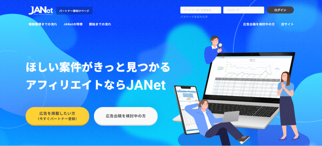 大手広告代理店のアドウェイズグループが運営し、金融ジャンルで圧倒的な存在感を放つのがJANetです。クレジットカードやFX、証券といった金融案件の取り扱いに強みがあります。