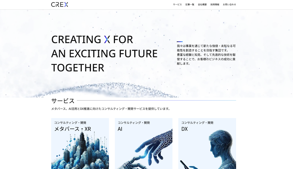 株式会社CREXは、「未知なる可能性と新たな価値を創造する」をビジョンに、メタバース/XR・AI・DXを中心としたコンサルティングおよび開発支援サービスを提供する企業です。