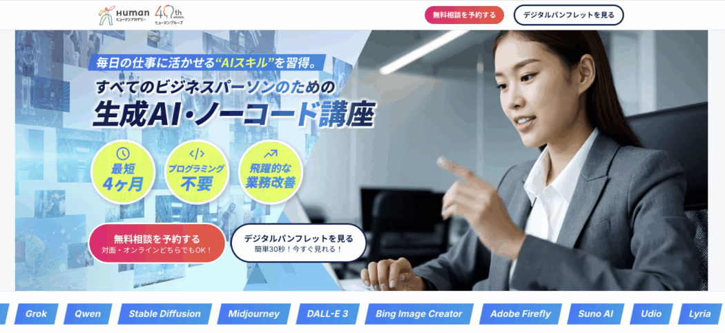 ヒューマンアカデミーが提供する「生成AI・ノーコード講座」は、実践的なAI活用スキルを学べる講座です。本講座は、40年以上の教育ノウハウを持つヒューマンアカデミーと、AI企業であるレッジが共同で開発しました。