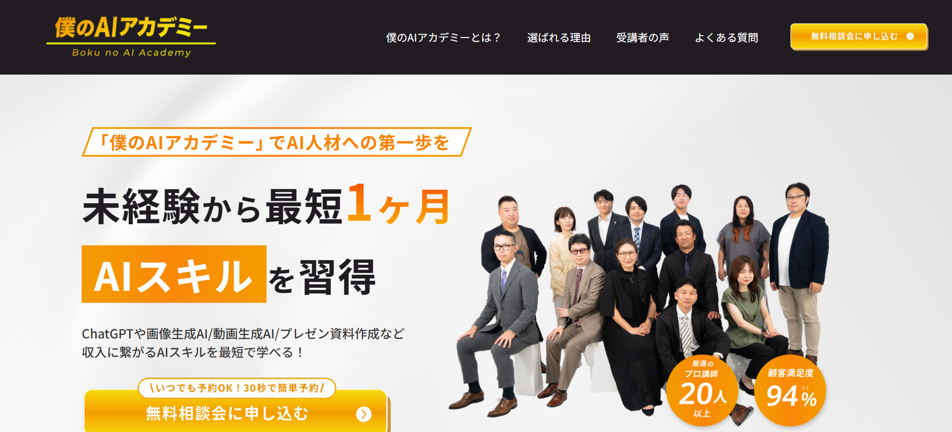 未経験から最短1ヶ月でChatGPTや画像・動画生成など実践的なAIスキルを習得可能。現場経験を持つ約30名の講師が個別指導。