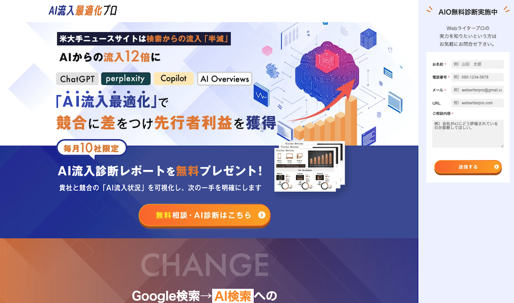 AIO・LLMOを含むSEO × GEO × AEOの複合的な対策を提供し、検索AI時代に適した集客戦略を提案できる点が強みです。