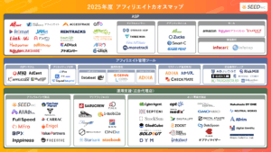 カオスマップでは、アフィリエイト広告に関連する企業・サービスを以下の3つのカテゴリに分類し、合計98社をマッピングしています。