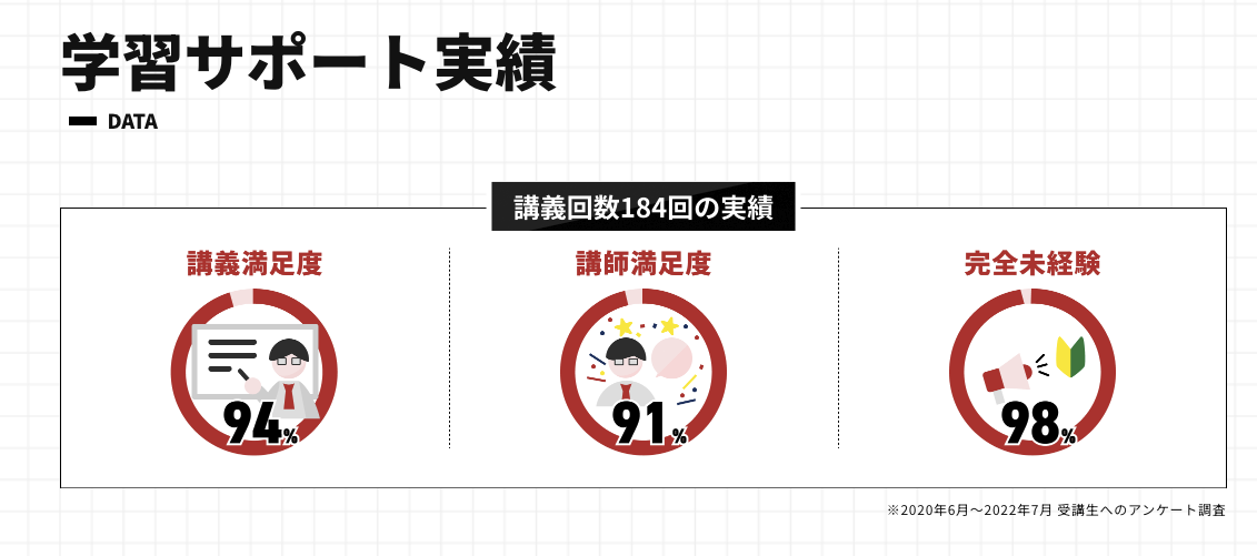 専門家の厳しい指摘は、独学では得られない深い学びが多いです。学習範囲は現場ですぐに使う技術に絞られており、効率的です。主体的に動く練習を重ねれば、未経験からでも実務能力が向上します。