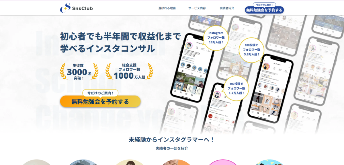 未経験の状態からわずか半年間で、収益化を実現するインフルエンサーへと導くスクールがSnsClubです。指導にあたる講師陣は全員が現役で活躍する実力派インフルエンサーのみで構成されており、机上の空論ではない経験に基づいたノウハウを直接吸収できます。
