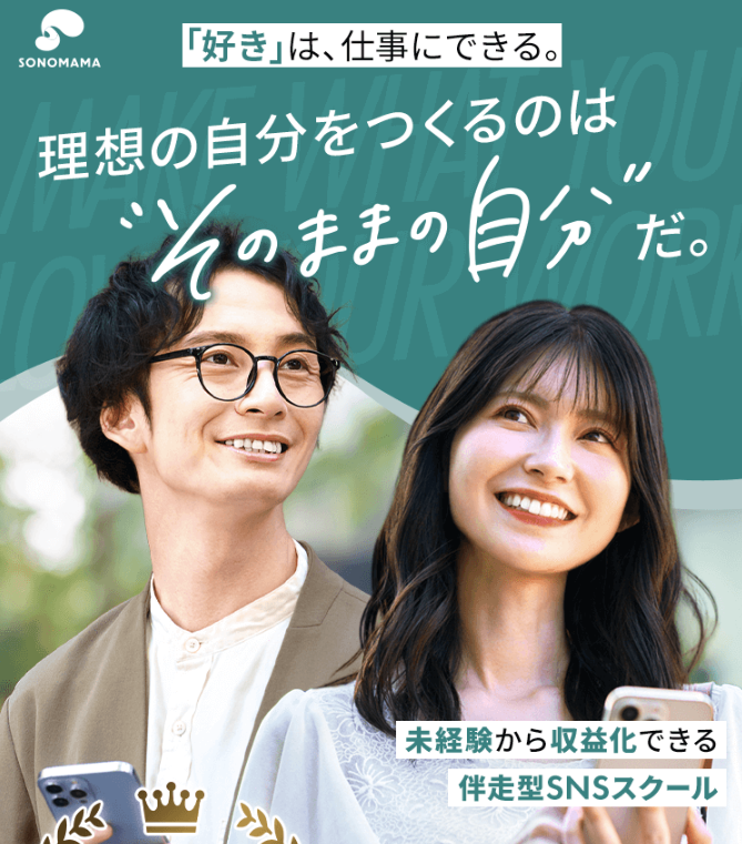 SONOMAMAは、総フォロワー59万人を誇る九島氏率いる株式会社メディアエイドが運営する、伴走型のSNSスクールです。月々最低19,600円(税込)~という手頃な価格でプロのノウハウを吸収できます。
