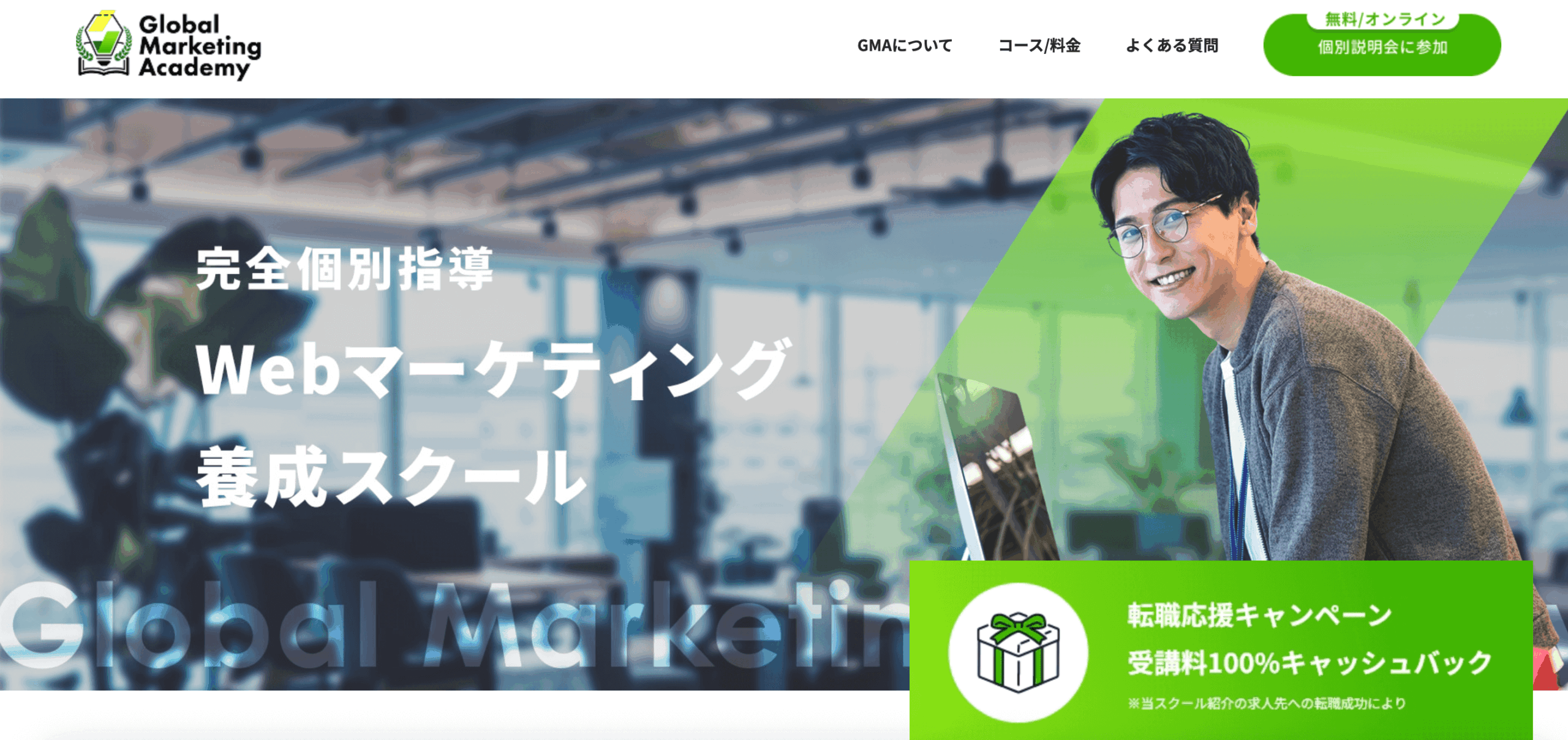 GMA(Global Marketing Academy)は、Webマーケ業界未経験者向けの実践型Webマーケティングスクールです。
