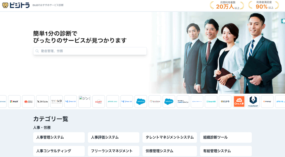 ビジトラは、月間利用者20万人以上、利用者満足度は90%以上を誇る、BtoB向けおすすめサービス診断サイトです。