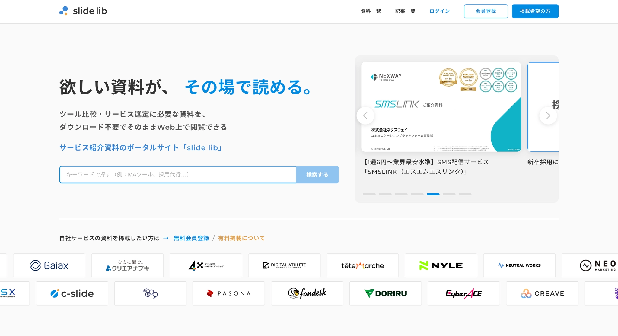 slide lib(スライド リブ)は、ツール比較・サービス選定に必要な資料をダウンロード不要でWeb上で閲覧できるBtoBサービス比較サイトです。