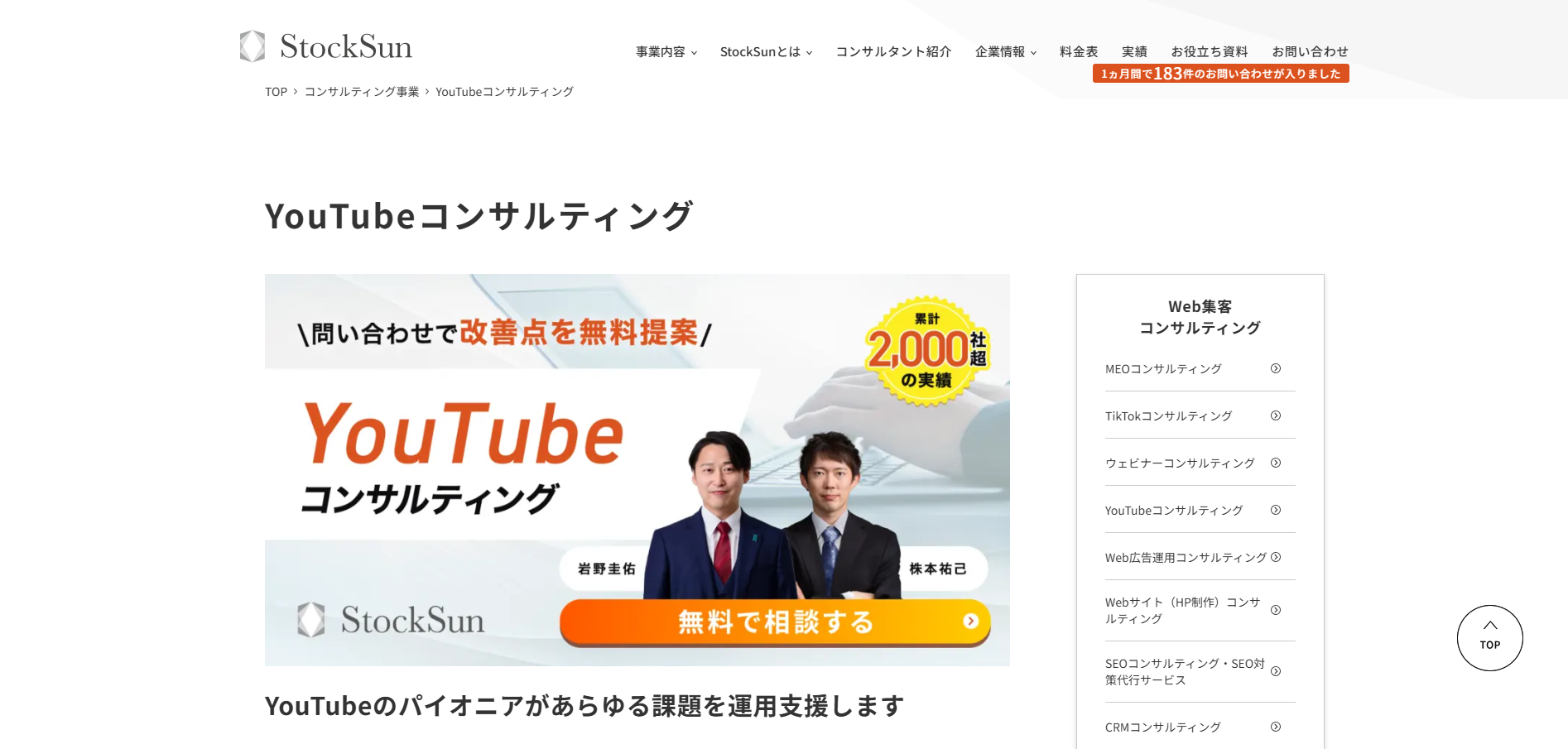 | StockSun株式会社 | 利益へのコミットを最優先とし、認定パートナーが実利に繋がるチャンネル運営を行います。年収チャンネルなど自社メディアでの成功体験が豊富にあります。 | 月額コンサル5万円〜 |